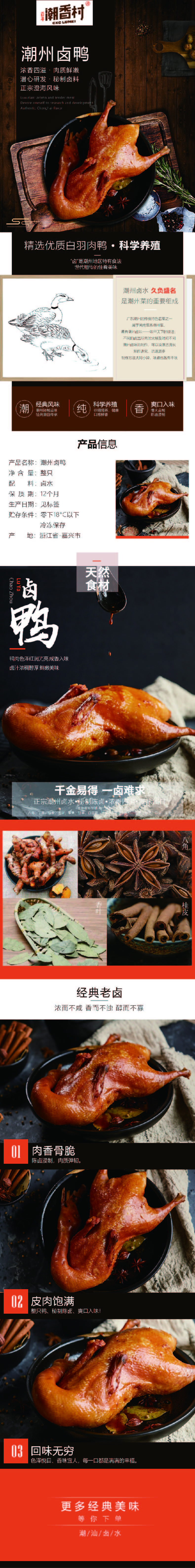 產(chǎn)品介紹:潮州鹵鴨——潮香村做的鹵鴨,只用新鮮鴨,拒絕冰凍鴨,自然散養(yǎng)的白羽肉鴨,皮薄肉瘦,光看著就覺(jué)得美味可口~配上絕不外傳的秘制鹵水配方,每一滴都是精華,鹵制以后,味道香醇撩人。 感受一只鴨的百般嫵媚。 工藝:陳鹵鹵制 規(guī)格(g):整只 包裝規(guī)格:1只/袋 箱規(guī):無(wú)